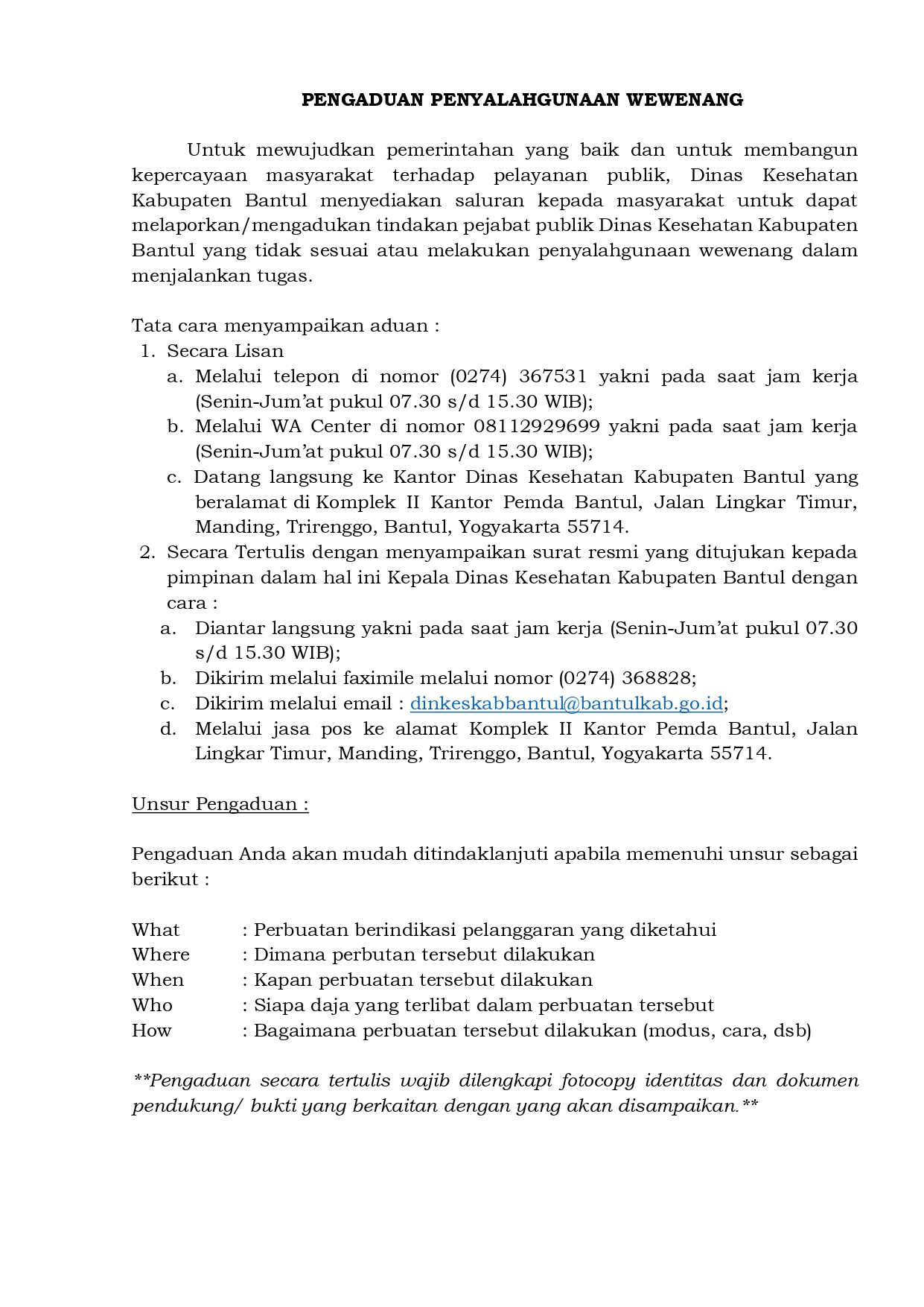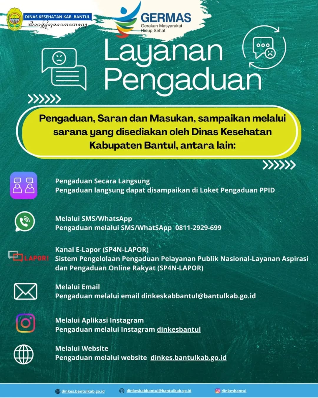 Sampaikan pengaduan, saran, dan masukan melalui sarana yang disediakan oleh Dinas Kesehatan Kabupaten Bantul